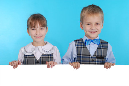 Portrait of smiling schoolchildren looking at camera while standing in classroom
