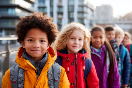 Group of smiling schoolchildren wearing backpacks, standing outdoors near a school building, dressed in colorful jackets, showing happiness, diversity, and friendship