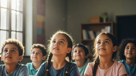 Students look up to the teacher. A group of children is sitting in a school classroom in class. The scene is full of curiosity and surprise, as the child seems to be thinking about something