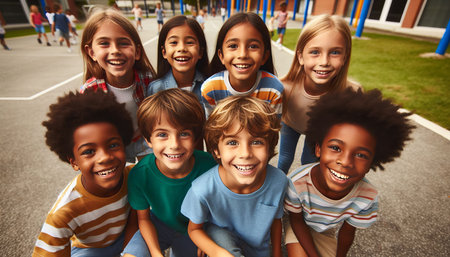 A diverse group of children, ranging in ages and ethnicities, standing next to each other in a row. They are all looking towards the camera with smiles on their faces, creating a heartwarming and inclusive scene.
