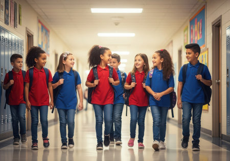 A diverse group of happy elementary school children walks cheerfully down a bright school hallway carrying backpacks. Their smiling faces and interaction convey a sense of friendship, learning, and a positive school environment.