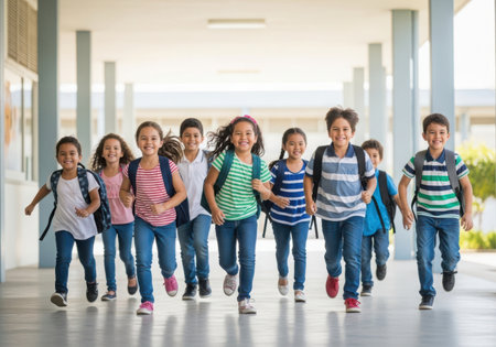 Cheerful children with backpacks running joyfully down a vibrant school hallway, eagerly anticipating the excitement of the school day ahead