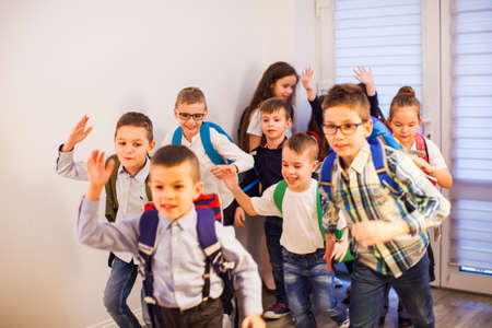 Group of elementary school kids with backpacks in school corridor. Back to school