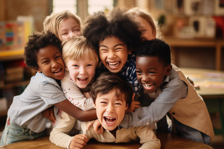 Group of joyful diverse kids showing various expressions in a classroom setting