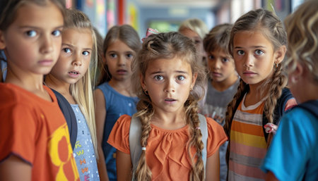 The girl expresses surprise when talking to her friends at school, creating an atmosphere of lively and interesting conversation.