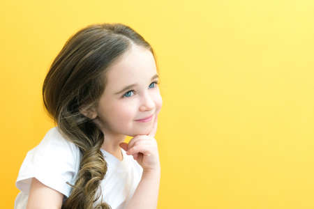 Thoughtful little girl touching observation chin, thoughtful cute daughter making decision, imagining thought, posing isolated over yellow background