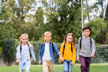 Kids go back to school. Interracial group of children of mixed age run and cheer on the first day of new academic year. Start of school holiday. Preschooler or kindergarten kid. child in school yard.