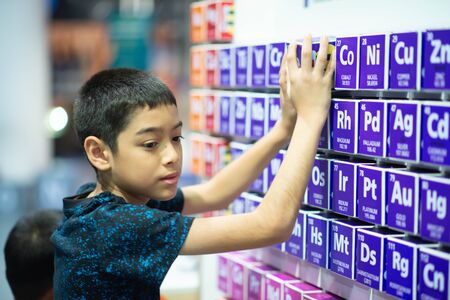 One kid choose parts of robotic electric toys for his age of four to build robots at robotics school lesson.