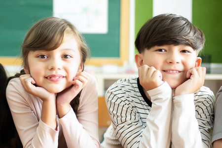 Back to school! Portrait of happy schoolchildren sitting on desk holding hand on chin and looking at camera in classroom.Education, elementary school,Childhood concept.