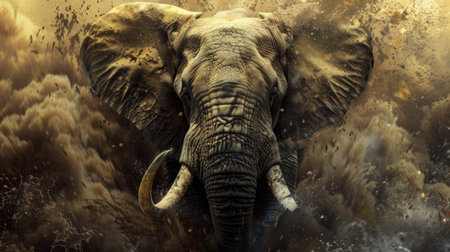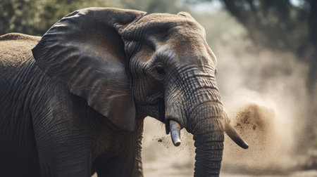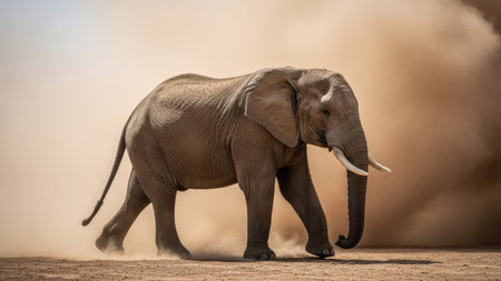 An elephant walks through a cloud of dust. The image presents a side view of the large mammal against a blurry backdrop. The scene suggests an outdoor environment, possibly during daylight, illuminated by natural light. This image could be used for various commercial or editorial purposes.
