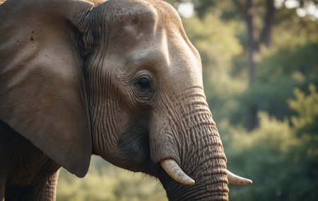 A closeup of an African elephants face with its ivory tusks and trunk snout in focus, set against a backdrop of trees in a natural landscape