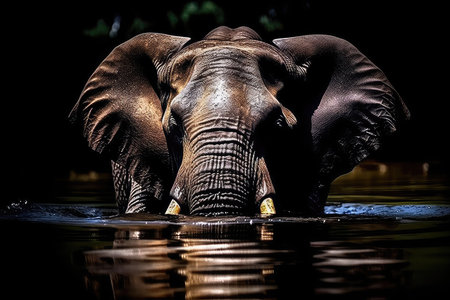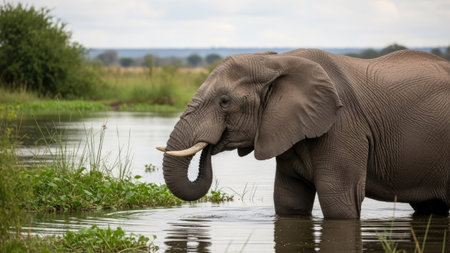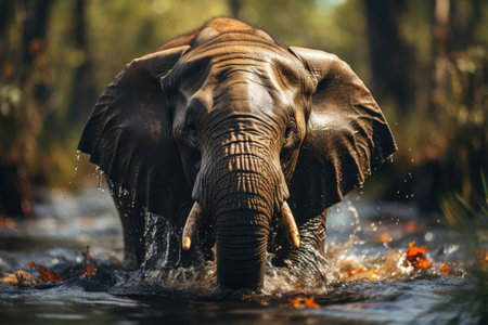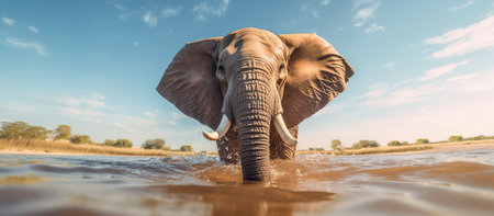African Elephant wading through the shallow waters Generative AI