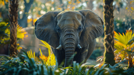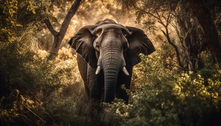 An impressive African elephant emerges from the golden-lit jungle. Wildlife scene.