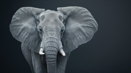 Black and white portrait of an elephant showcasing its prominent features and tusks against a dark background