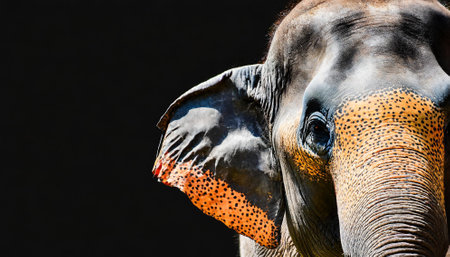 A stunning close-up of a colorful elephant adorned with vibrant Holi powder against a dark background, showcasing beauty and cultural significance in a unique artistic way.