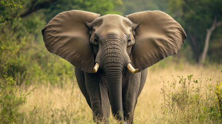 A large bull elephant flaring its ears and raising its trunk, showcasing its dominance in the wild.