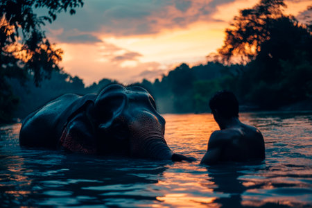 A serene scene of an elephant walking through a misty jungle during dawn. The vibrant colors of the sky enhance the tranquil atmosphere, perfect for nature lovers.