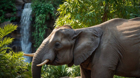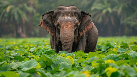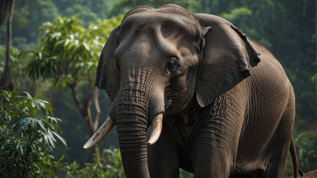 A magnificent elephant stands gracefully in the heart of a lush green forest, surrounded by vibrant foliage and a tranquil mist. This captivating wildlife scene embodies the beauty of nature.