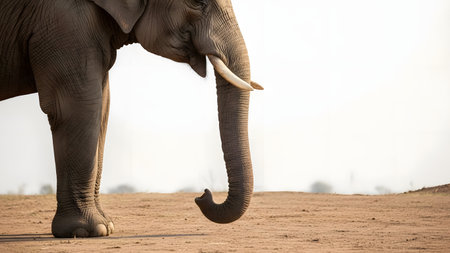 A side profile view of a large African elephant standing on dry, dusty ground. The image highlights the texture of its wrinkled skin, long trunk, and tusks against a hazy, bright background.