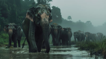 Wild Asian Elephants Journey through Misty Jungle after Refreshing Mud Bath