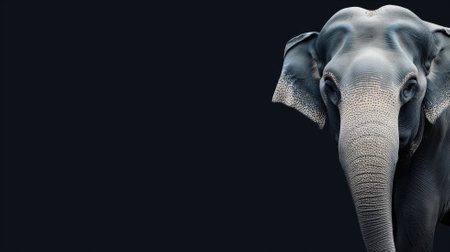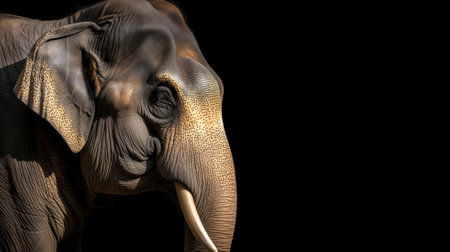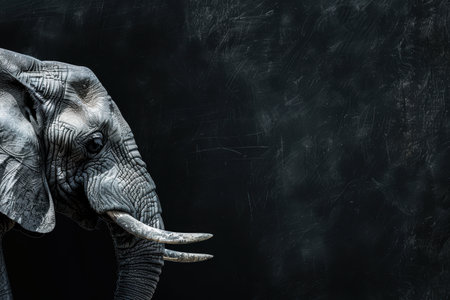 A close-up of an elephant in high contrast against a dark background, highlighting the texture and contours of its face