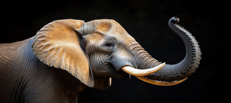 African Elephant With Raised Trunk, a Portrait With Isolated Black Background Wild Life Image