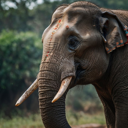 A beautifully adorned elephant showcases intricate patterns and bright colors, symbolizing joy and cultural traditions. This majestic creature stands proudly amid a lush green backdrop.