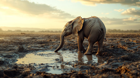 Rare view of an african huge baby elephant (Loxodonta Africana) taking a mud bath during a safari in Addo National Park, South Africa.