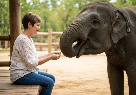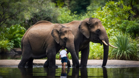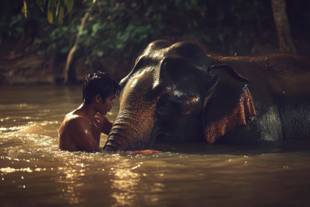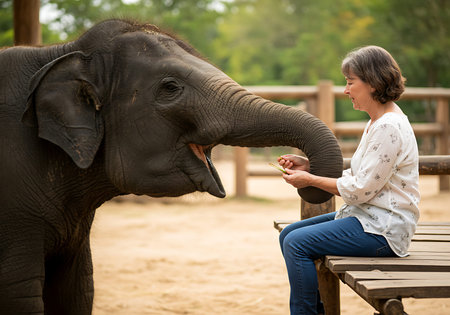 A serene interaction between a gentle elephant and a person capturing the essence of connection in nature, surrounded by warm light and an atmosphere of tranquility.