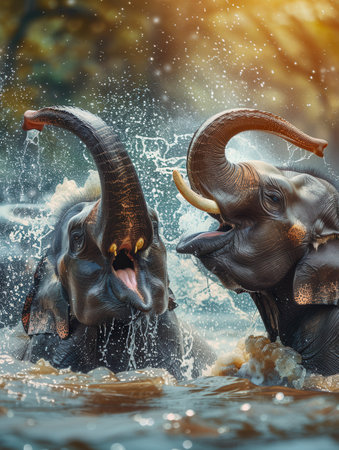 Two elephants are joyfully splashing water at each other while bathing in a river under sunlight, showing casing playful interactions in their natural habitat.