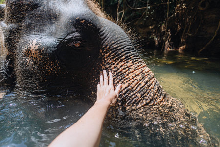 person gently touches the trunk of an elephant submerged in clear water, surrounded by lush vegetation. scene captures a moment of connection and tranquility in a natural setting.