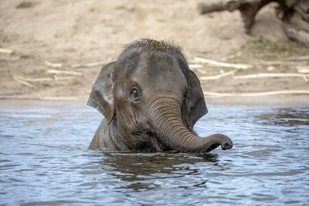 Close-up of a young Asian elephant, likely a calf, in a zoo enclosure. Generative Ai
