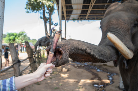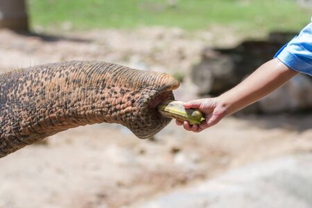 Elephant feeding. Portrait of cute elephant who stretches a hairy trunk for a banana. Elephant trunk close up. Safari park, Phu Quoc island, Vietnam.