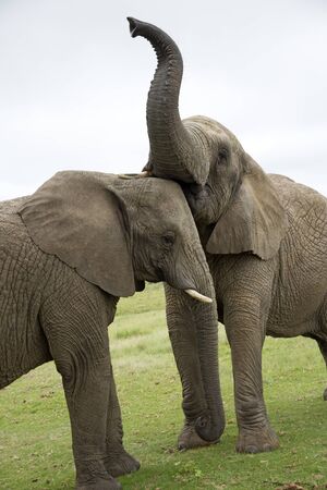 Young wild African elephants play to keep warm on a cool day in Knysna western cape South Africa