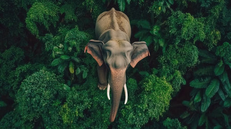 An aerial view of a majestic elephant standing amidst the vibrant greenery of a lush jungle, showcasing the beauty and diversity of wildlife in nature.
