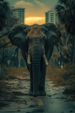 A serene scene of an elephant walking through a misty jungle during dawn. The vibrant colors of the sky enhance the tranquil atmosphere, perfect for nature lovers.