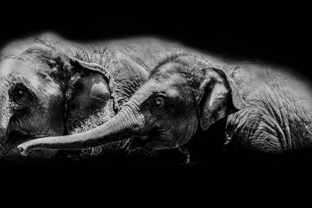 A close-up of an elephant in high contrast against a dark background, highlighting the texture and contours of its face