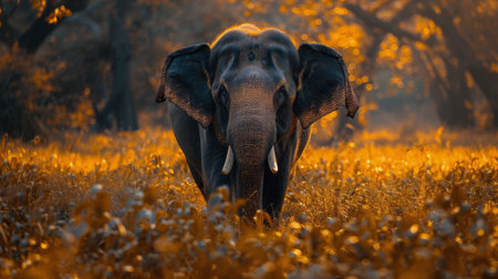 A magnificent elephant stands gracefully in the heart of a lush green forest, surrounded by vibrant foliage and a tranquil mist. This captivating wildlife scene embodies the beauty of nature.