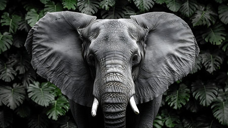 Black and white portrait of an elephant showcasing its prominent features and tusks against a dark background