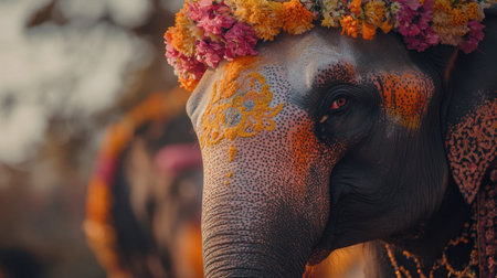 A beautifully adorned elephant featuring vibrant floral decorations, capturing the essence of celebration in nature. This stunning close-up showcases rich colors and intricate details.