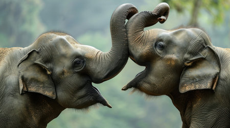 Two elephants display a touching interaction as the mother gently touches her baby with her trunk in their natural habitat.