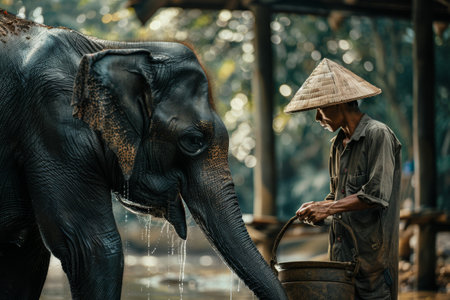 A elephant keeper feeds an elephant with a bucket. The man is wearing a straw hat