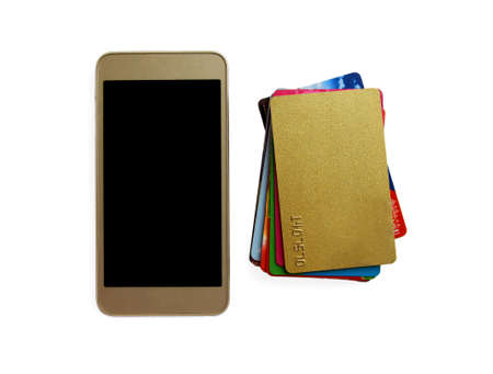 stack of bright colorful discount plastic cards and mobile phone, isolated on white. background with copy space.