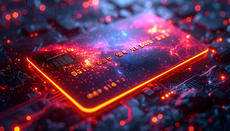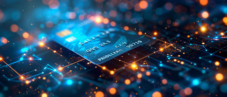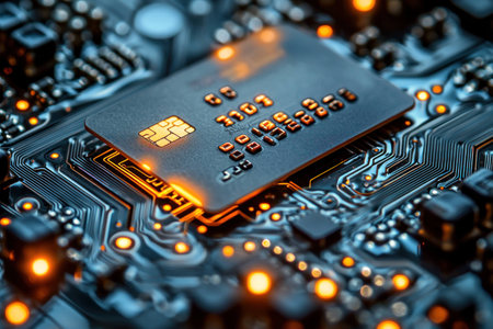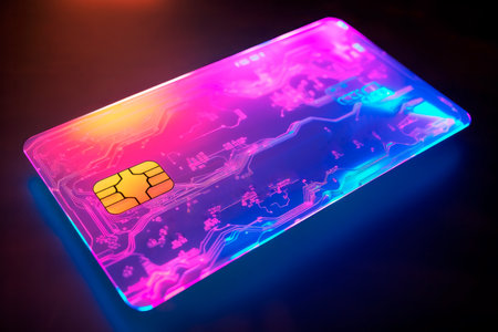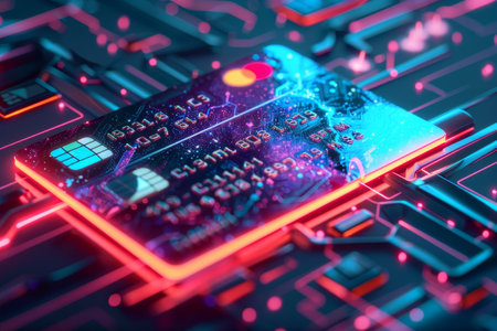 Detailed view of a microprocessor chip showing circuits and connections, A futuristic credit card with neon accents