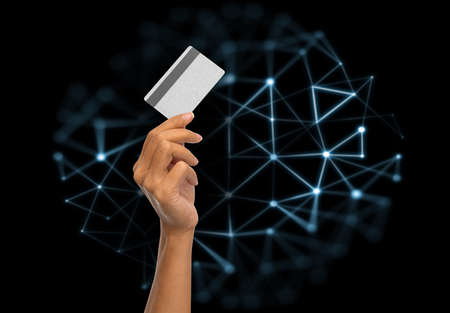 model wood pose holding the premium credit card for investment payment money banking and financial concept with server online internet lan wire, market shoping digital