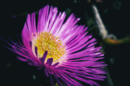 Macro of a carpobrotus flower with pink petals and yellow stamens illuminated by sunlight