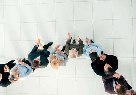 top view. business partners standing in front of a large group of employees.