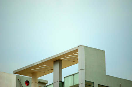 Modern building exterior with blue sky and white cloud, closeup of photo
