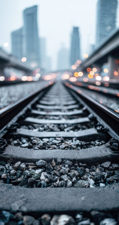 Railway tracks stretch towards a distant city skyline in a vertical composition. The image shows a close-up perspective of the tracks, leading the eye to a blurred background of buildings. The overall tone is cool with muted colors and a shallow depth of field, suitable for editorial and commercial projects.