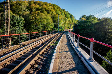 Railway bridge at low angle for strong perspective lines with sunlight through the treetop